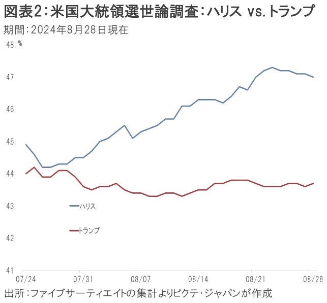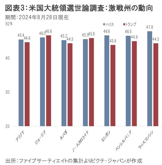 ABC系のニュースサイトであるファイブサーティエイトの集計では、足下、ハリス副大統領の支持率は全米で47.0%であり、トランプ前大統領の43.7%を3.3%ポイント上回っている(図表2)。共和党大会の終了後におけるバイデン大統領の撤退表明は、結果的に絶妙のタイミングだったと言えるだろう。民主党が3日間程度でハリス副大統領に一本化したことにより、短期決戦で最も重要な勢いを味方につけたのではないか。