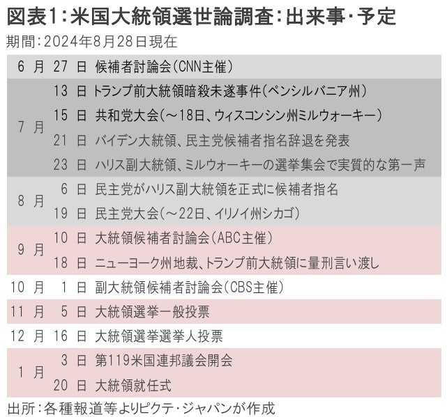 民主党大会が終わり、米国大統領選挙は早くも終盤戦を迎えている(図表1)。民主党大会は、バイデン大統領の他、ビル・クリントン、バラク・オバマ両元大統領、ヒラリー・クリントン元国務長官など大物が勢揃いし、挙党体制を強くアピールした。一方、先に行われた共和党大会は、ジョージ・ブッシュ元大統領やディック・チェイニー元副大統領など重鎮が姿を見せず、「トランプ党」の印象が際立つイベントだったのではないか。