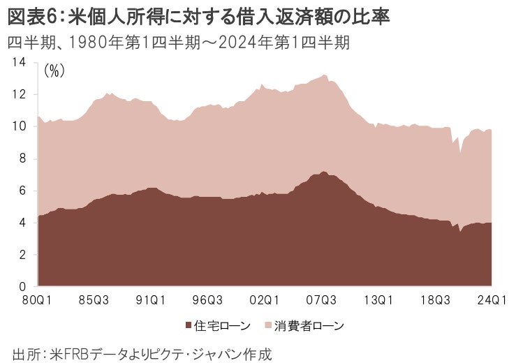 家計部門の借入金返済の所得に対する比率は、10%以下に留まっており、過去2年の金利上昇にも関わらず極めて安定している(図表6)。消費者ローンの返済比率はやや上昇傾向にあるが、住宅ローン返済比率は、所得に対して4%程度に留まっており、サブプライム危機勃発前の7%台に比べてかなり低位だ。賃金や投資関連収入が増加したことが、個人の収支バランスの安定に寄与しているとみられる。