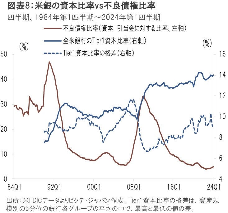 これらの脆弱性に金融システムは耐えられるのか。現在、米銀のTier1比率は過去最高水準に達しており、不良債権比率も過去最低水準近辺で推移している(図表8)。資本の格差もリーマンショック前等と比較して低位に留まっており、脆弱な銀行群が大きく痛んでいるわけではない。