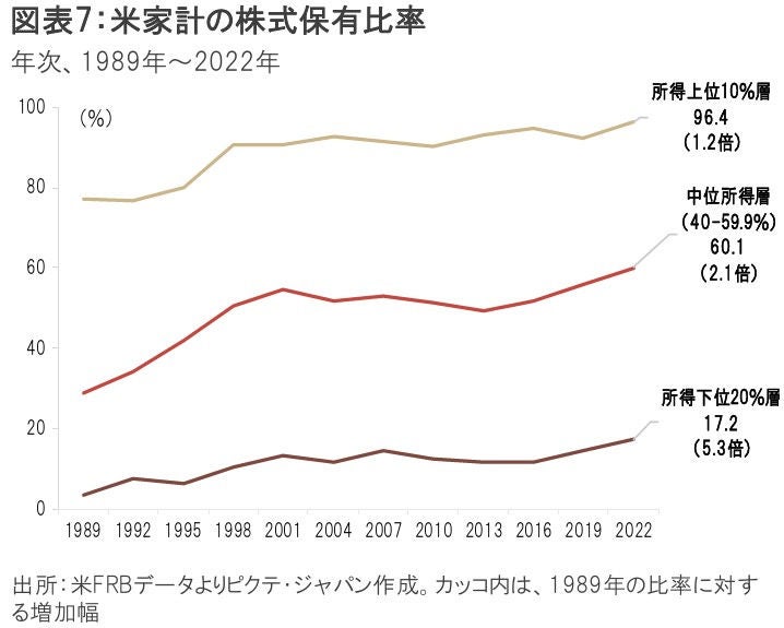 但し、個人セクターには、2つの懸念材料がくすぶる。第一に、冒頭に述べた失業率の上昇である。第二に、株価が下落した場合の逆資産効果である。図表7の通り、米国で株式を保有している家計の比率は全体に上昇しており、最富裕者層では96%にも上る。一方、所得が低い人々も、やりくりしながら株式に投資するようになっている。1989年に対象世帯の3.2%に過ぎなかった株式保有比率は、直近で5.3倍の17%まで上昇した。