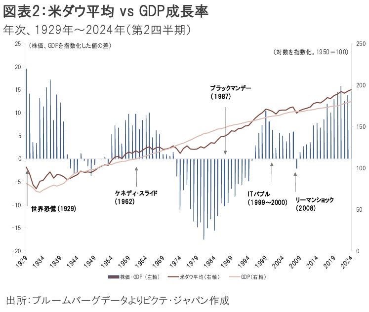 ところが、その米国株は、GDPの長期トレンドからの乖離が拡大しつつある(図表2)。過去の市場ショックは、株価がGDPのトレンドを上回っている時か、ブラックマンデーのようにGDPの成長速度を上回る株価上昇が続いた時に発生している。現在の株価はその両方の特性を備えている。