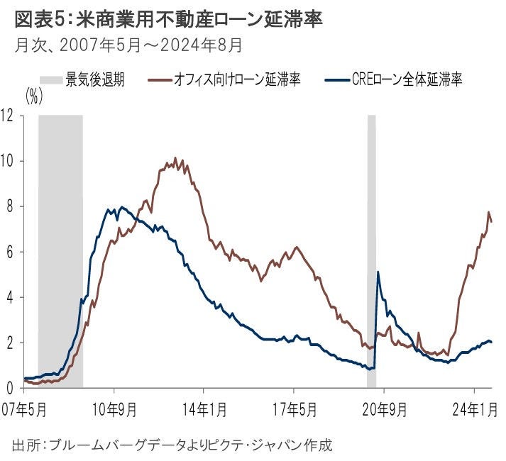 唯一、金利上昇の影響が深刻なのが商業用不動産セクターである。特にオフィスについては、価格下落が続き、年初からローンの延滞率が急上昇している(図表5)。ただし、この分野は、主に中堅・中小銀行の問題であること、銀行だけでなくノンバンク等の多様なリスクテイカーが資金提供を継続していることなどから、金融システム全体の危機の誘因にはなりにくいと考える。