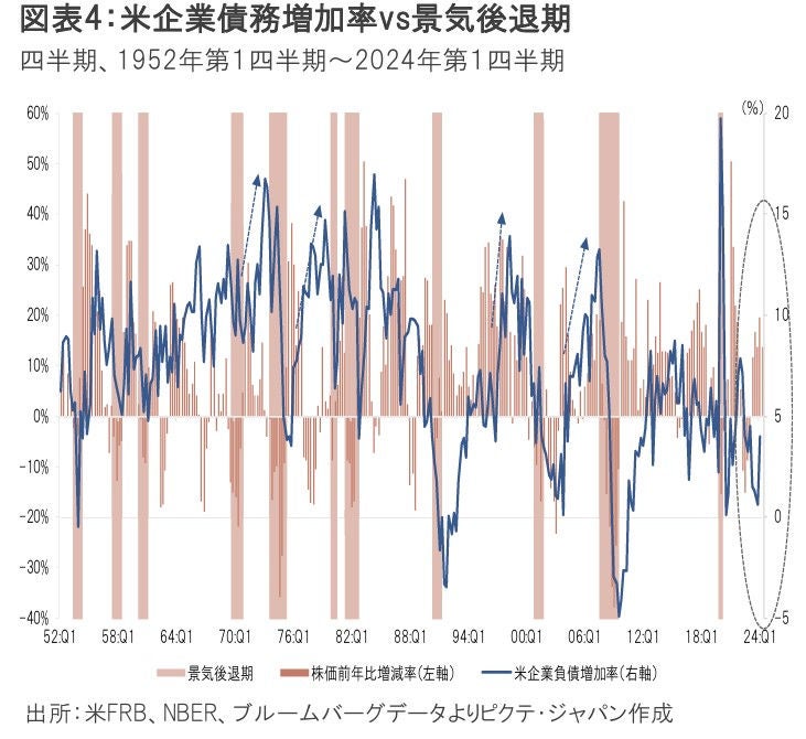 米国の景気後退は、一部例外もあるが、企業の借入が大きく増加し、ピークアウトした後に発生する傾向がみられる(図表4)。景気拡大期に企業が借入を増やし、その後金利上昇や景気減速の兆しとともに借入の伸びが鈍化し景気後退が始まる。