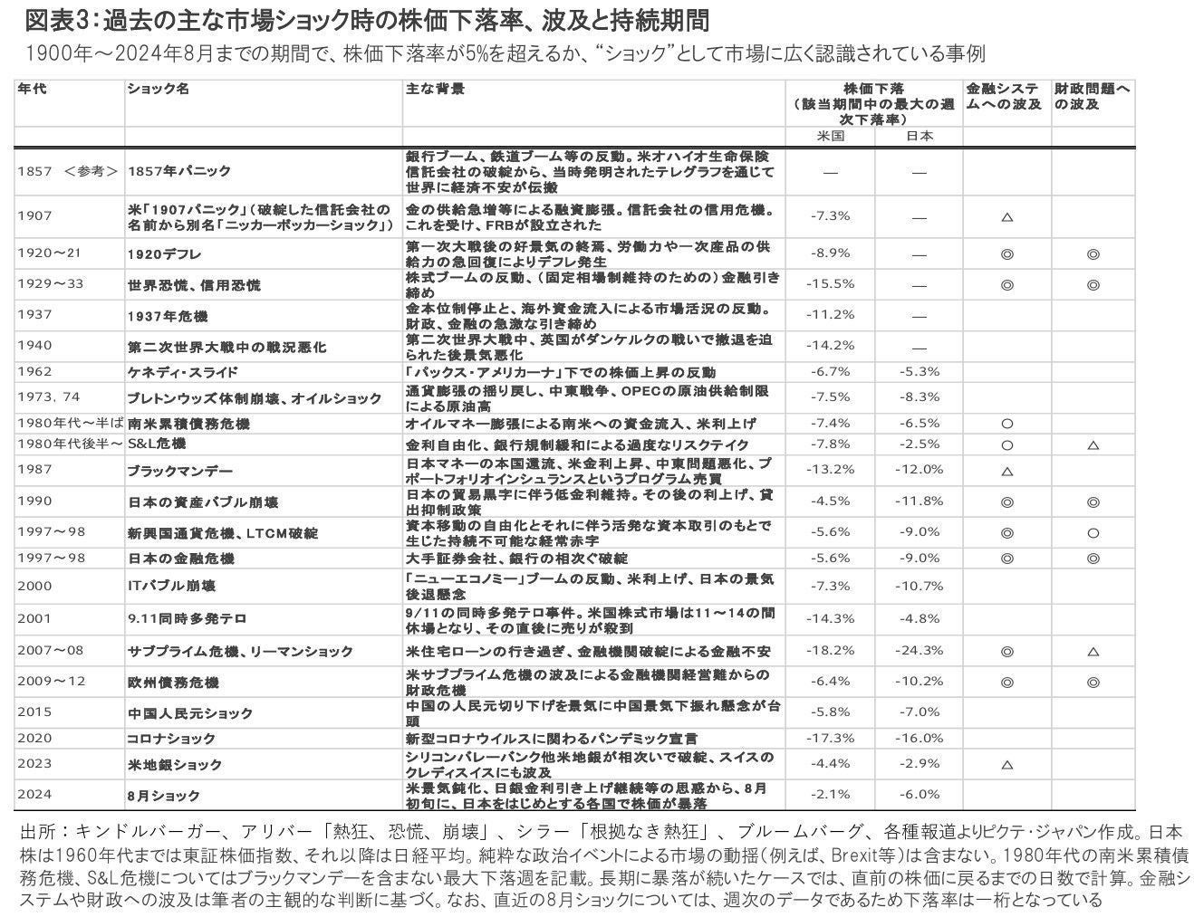 問題は、株価が再度下落した場合に、その後どの程度の時間軸で回復するのかである。仮に、日本のバブル崩壊時やリーマンショックのように影響が長期化してしまうなら、下落時のリスクテイクは報われ難いかもしれない。過去のショックの事例を振り返り、市場への影響が長引く条件を考える。