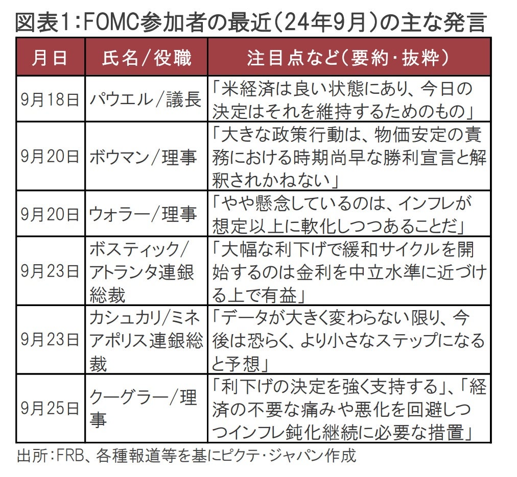 なお、9月のFOMCでは会合前に当局者から大幅利下げを示唆するコメントはほぼ聞かれず、ブラックアウト期間中の新聞報道で織り込みが進んだ印象だ。情報発信のあり方に疑問も残る。