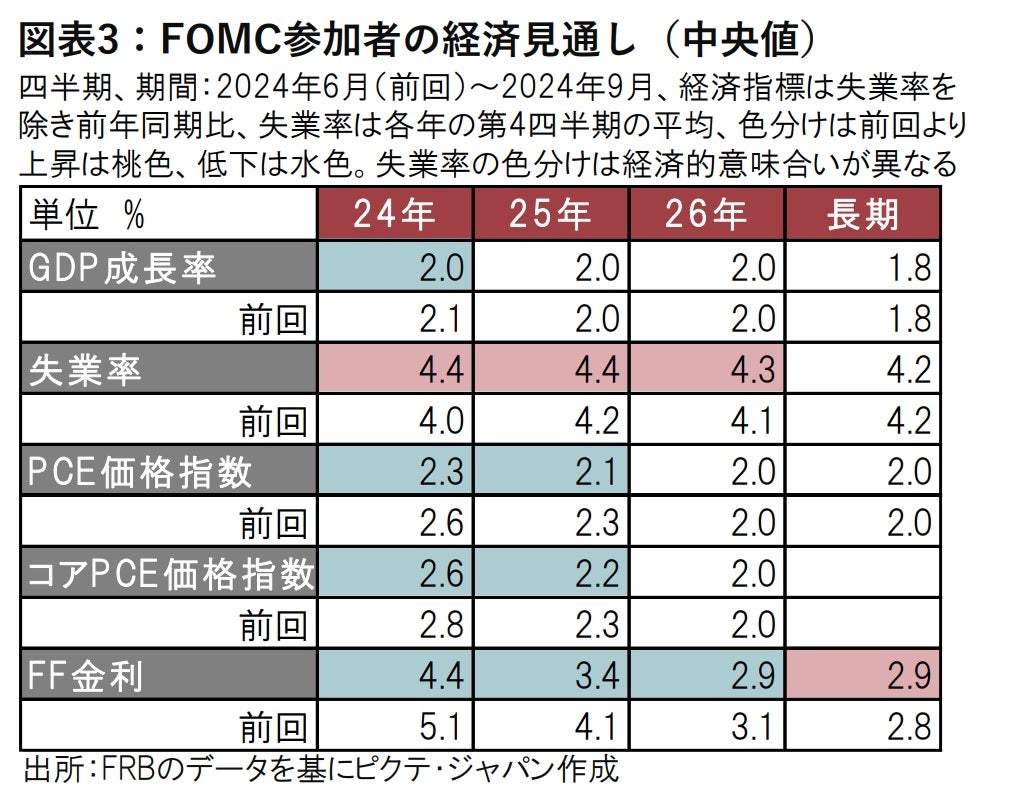 反動の背景は、大幅利下げで緩和局面が始まったものの、今後の利下げの道筋には大幅利下げが見込まれていないことが挙げられる。。また、中立金利の代替とみられるフェデラルファンド(FF)金利の長期水準が2.9%へと引き上げられたことも長期金利を下げにくくしているのだろう(図表3参照)。