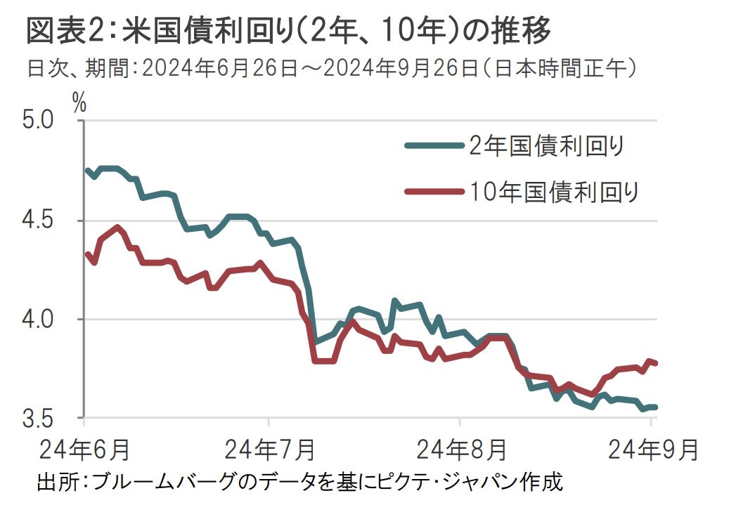 次に、FOMC後の米国債市場を見ると、大幅利下げにもかかわらず、10年国債利回りはFOMC後、小幅ながら上昇した(図表2参照)。おそらくFOMC前に大幅利下げを織り込む過程で生じた利回り低下の反動なのだろう。