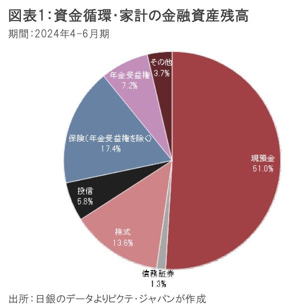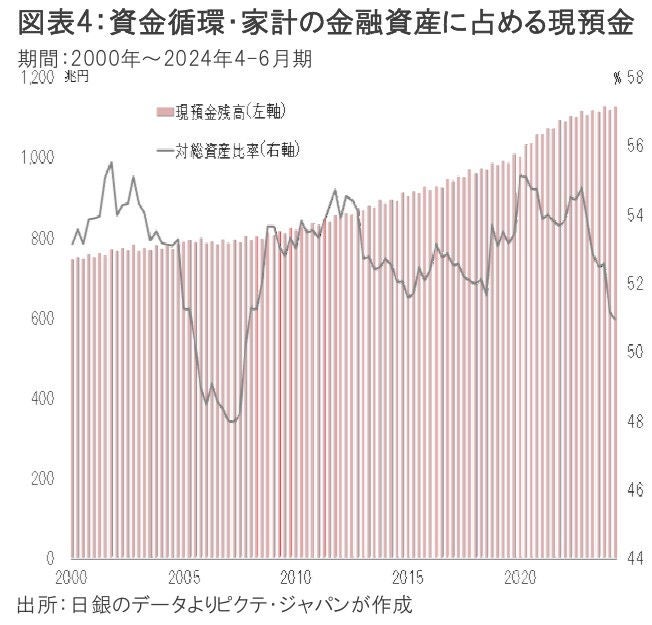 日銀は、9月19日、今年4-6月期の資金循環統計を発表した。個人金融資産の残高は2,211兆6,511億円となり、7四半期連続で過去最高を更新している(図表1)。現預金は1,126兆9,845億円で過去2番目の高水準だ。新NISAの導入などで家計の資産運用への関心は高まっているものの、現預金が全体の50%を超える状態が続いた。