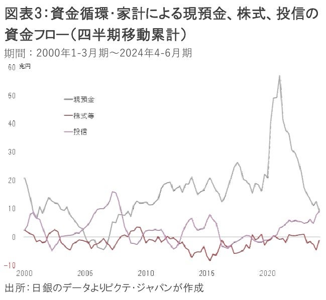 ちなみに、直近1年間は現預金と投資信託への資金流入額がほぼ同水準だった(図表3)。こうした現象は、2008年1-3月期以来のことである。株式は小幅な売り越しが続いているものの、家計の資産運用への意欲はようやくリーマンショックを乗り越えたと言えるのではないか。