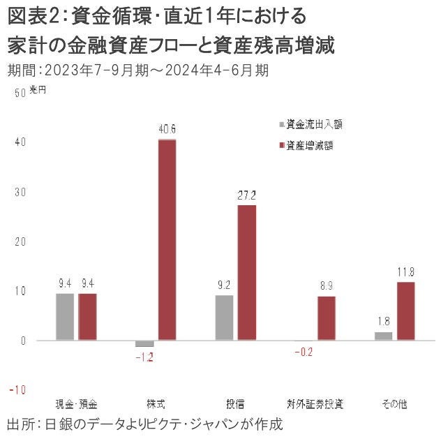 例えば株式の場合、この間、1兆2,137億円の資金流出だった。一方、資産残高は40兆5,660億円膨らんだ(図表2)。1年間で家計の保有する株式は15%程度上昇したことになる。また、投資信託は9兆1,583億円の資金流入に対し、資産残高は27兆2,495億円増加した。その結果、残高が127兆9,503億円に達し、7四半期連続で過去最高額を更新している。