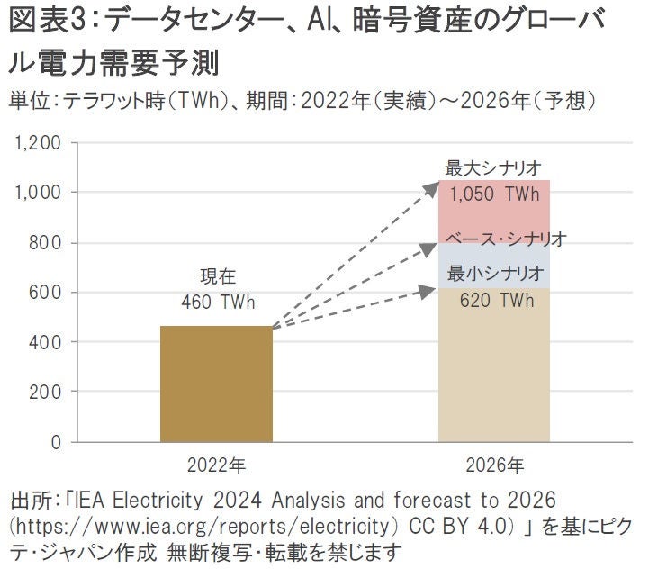 IEAの予測では、データセンター、AI、暗号資産のグローバル電力需要は、2022年時点の460テラワット時から2026年には最大で1,050テラワット時まで急増するシナリオが示されており、この増加分はドイツの年間電力消費量に相当する(図表3)。