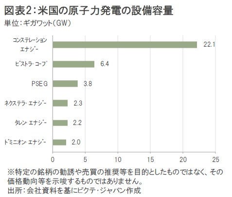 ビストラ・コープはテキサス州に本社を構える発電会社で、原子力発電が同社の発電容量全体に占める割合は16%(6.4GW)であり、発電容量では全米2位だ。一方、コンステレーション・エナジーは2022年2月に米電力会社大手エクセロンからスピンオフされた発電会社で、米メリーランド州に本社がある。原子力発電が同社の発電容量全体に占める割合は67%(22.1GW)で、発電容量では全米最大となっている(図表2)。なぜ原子力発電株がこれほどまで急騰したのか?その理由は生成AIブームに伴う電力需要の増大だ。