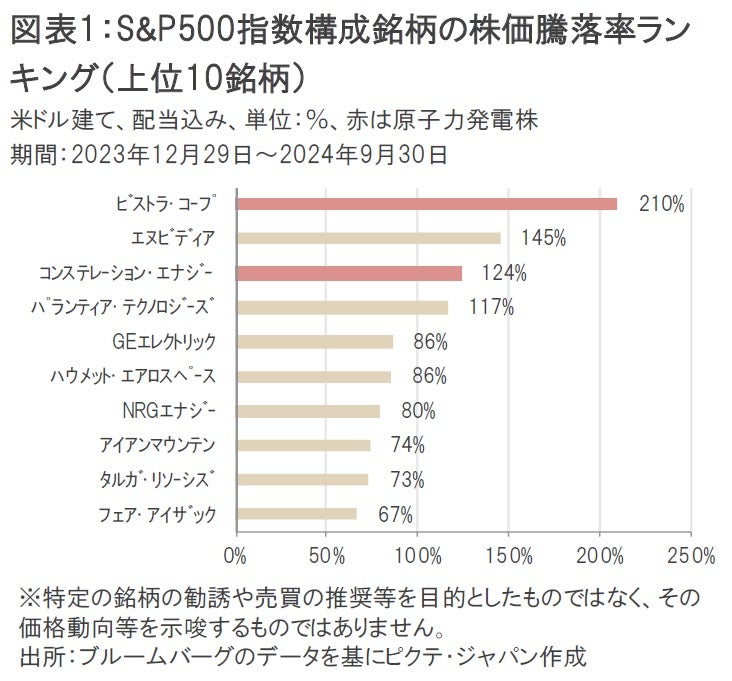 S&P500指数構成銘柄の年初来(2023年12月末-2024年9月末)の株価騰落率ランキングにおいて、生成AI(人工知能)向けのGPU(画像処理装置)等を手掛けるエヌビディア株が2位に入った。この結果に特段の驚きはないが、特筆すべきはその前後に原子力発電株が並んだことだ。ビストラ・コープは年初来で+210%、コンステレーション・エナジーは+124%と、突出した株価パフォーマンスを示している(図表1)。