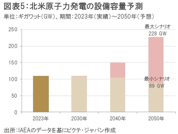原子力発電はCO2の排出量が少ないうえ、休止中の発電施設も多く存在する。9月20日にはコンステレーション・エナジーがスリーマイル島の原子力発電所を再稼働させ、マイクロソフトのデータセンター向けに20年間電力を供給する契約を発表したばかりだ。国際原子力機関(IAEA)の最大シナリオでは、2050年にかけて北米の原子力発電の設備容量が現在の約2倍に相当する228GWまで増加すると予測されているが、2030年時点では微増に過ぎない(図表5)。