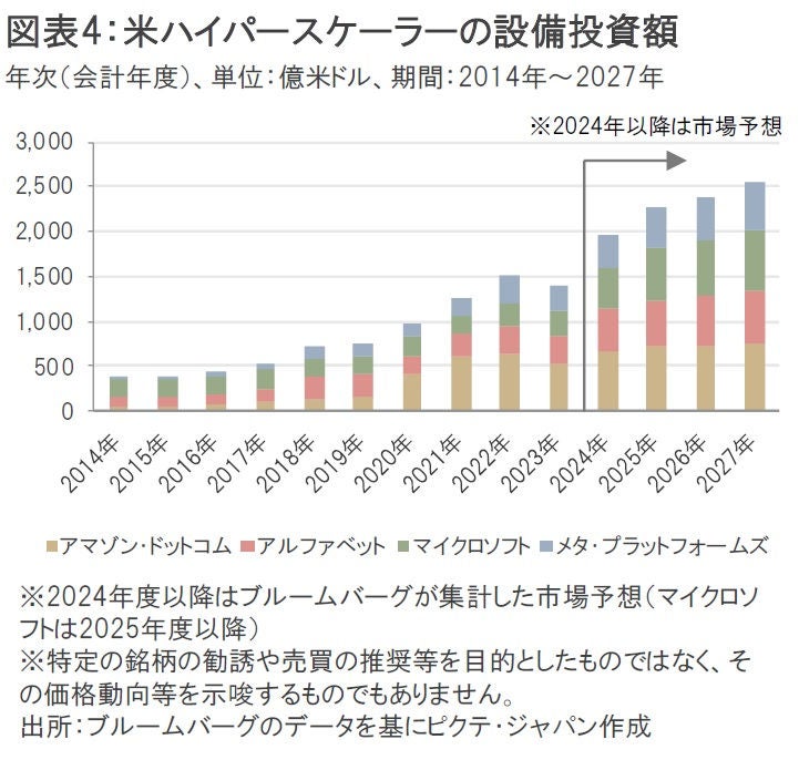 生成AIブームに対応するため、データセンターへの投資を加速させているのがハイパースケーラーと呼ばれるハイテク企業大手だ。アマゾン・ドットコム、アルファベット、マイクロソフト、メタ・プラットフォームズの4社は、ここ数年で設備投資額を大幅に増額させており、その大半がデータセンターへの投資と見られている(図表4)。