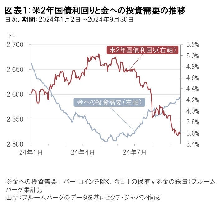 債券市場はこうした金融政策の転換を先行して織り込む傾向がある。新たに発表される経済指標や中央銀行関係者の発言を受けて将来の金利動向を予測し、それを織り込みにゆくからだ。特に米2年国債利回りは、こうした政策金利の見通しを敏感に反映するものと考えられている(図表1参照)。年初来の動きを見ると、5月以降、利下げ予想の高まりを受けて利回りは低下傾向にあった。このような局面では金価格は上昇する傾向があり、5月頃から金への投資需要も増加に転じている。では、今後の金価格はどのように推移するのだろうか。過去の事例をもとに考察する。