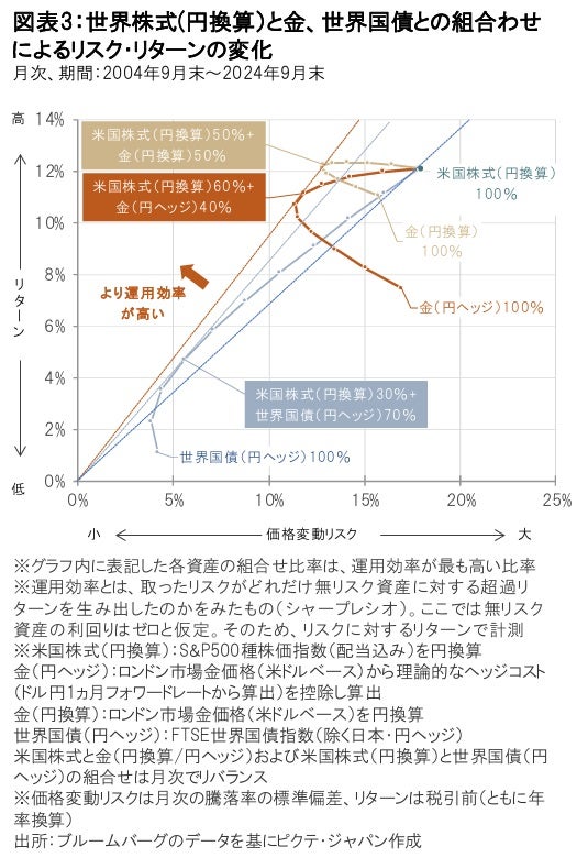 過去20年を振り返ると、米国株式(円換算、為替の影響も加味した値動き)に金を組み入れることでリスク低減効果に加え「運用効率」(リスクに対するリターン)の向上をもたらした。それは世界国債(円ヘッジ)の組み入れの効果を上回った(図表3参照)。