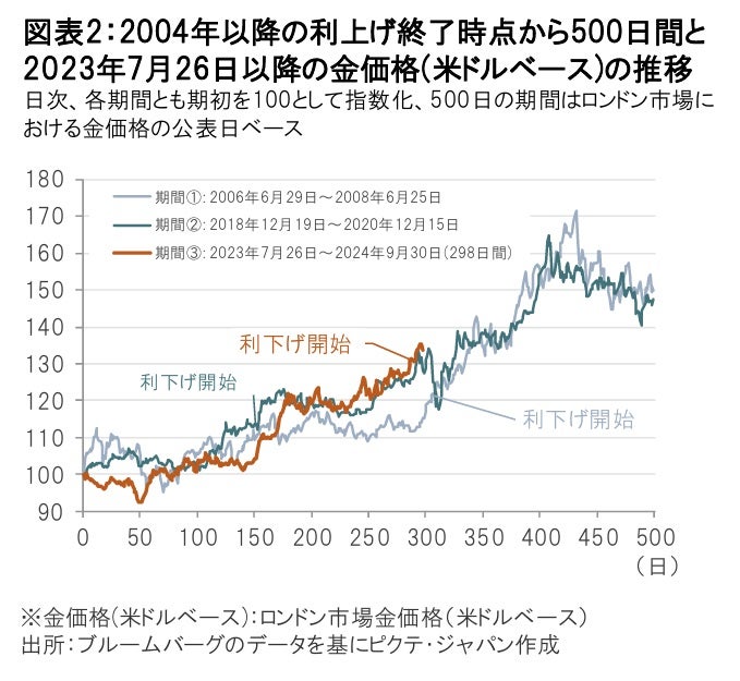 それぞれの年の最後の利上げ日を起点に、その後約2年間(500営業日)の金価格の推移を見ると、それぞれ約50%、47%と大幅な上昇を示した(図表2参照)。参考までに、同期間の米国株式(配当込み)の推移は、それぞれ+8%と+53%となり、まちまちの動きとなった。
