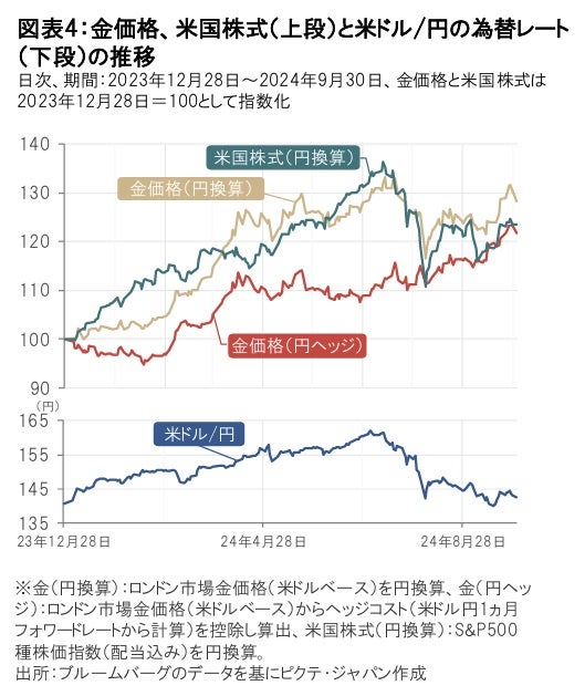 今年に入ってからの金価格(円換算)と米国株式(円換算)のチャートを見てみよう(図表4参照)。7月から8月にかけての急速な円高進行により、金価格(円換算)と米国株式(円換算)はともに大きく下落したが、金価格(円ヘッジ)は比較的安定した値動きとなっている。