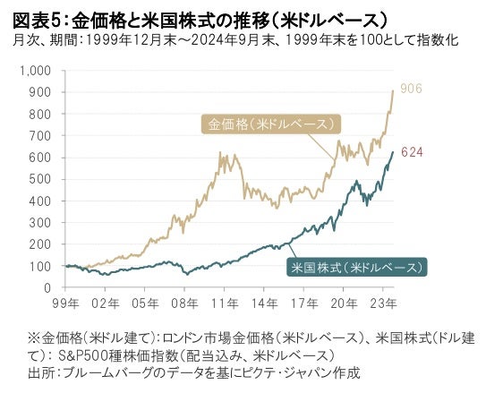 2000年に入り足元までを振り返ると、金は米国株式を上回るリターンとなっていたことはご存じだろうか。1999年末から2024年9月末までの24年9カ月の間に、S&P500(配当込み)は米ドル建てで約6.2倍となったが、金価格はそれを上回る約9.1倍となった(図表5参照)。
