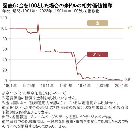 こうした観点でさらに歴史を長期的に振り返ると、米ドルは金利を考慮しなければ金に対してその価値が100分の1以下となった(図表6参照)。その大きな原因として考えられるのは、過去2度にわたる世界大戦や大恐慌、世界金融危機、そして新型コロナショックなどの危機的状況において、景気下支えや景気回復を目指した通貨供給量の増加などが考えられる。