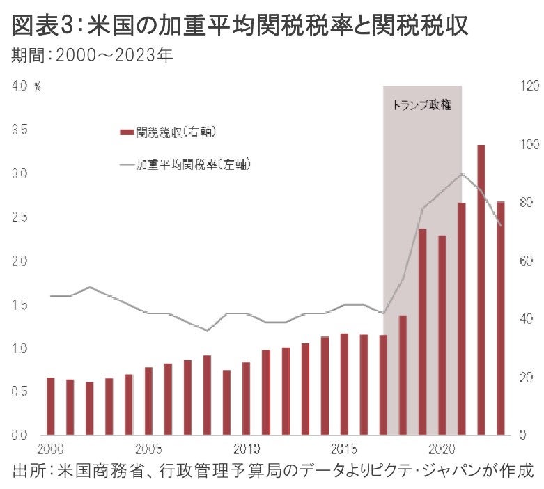 また、トランプ政権時代、米国の関税率は加重平均で1.4%から3.0%へと上昇した。仮に基礎的関税が全輸入品に導入された場合、ピーターソン国際経済研究所は、2025年の消費者物価が4.1~6.9%ポイント、2026年は4.1~7.4%ポイント押し上げられるとの試算を示している。