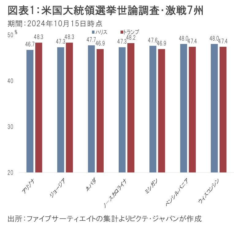 米国大統領選挙は投票日まであと3週間を切った。ABC系のニュースサイト、『ファイブサーティエイト』の集計によれば、10月15日現在、全米における支持率はハリス副大統領が48.5%、トランプ前大統領が46.1%、歴史的な僅差になっている。特に勝敗を決すると見られる激戦7州では、両候補の差がほとんどない状態だ(図表1)。