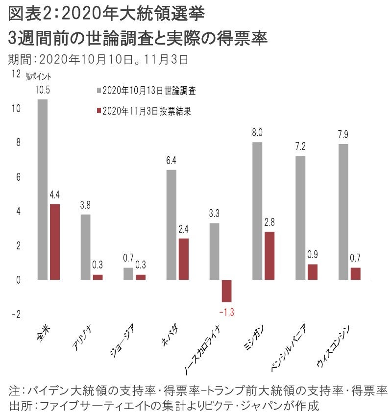 2020年の前回大統領選挙では、投票日まで3週間前の時点における世論調査において、ジョー・バイデン大統領がトランプ前大統領に対し全米で10.5%ポイントのリードを維持していた(図表2)。また、激戦でも同大統領が軒並み優位になっていたのである。しかしながら、実際の得票率を見ると、バイデン大統領のリードは全米で4.4%ポイントに過ぎず、ノースカロライナはトランプ前大統領が1.3%ポイント差で勝利した。