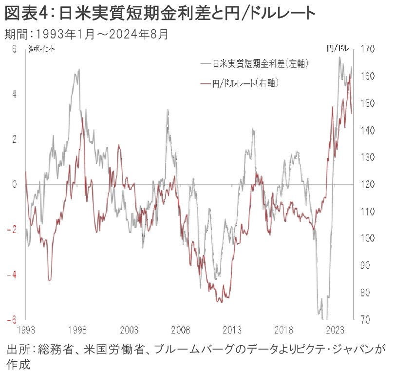 円・ドル相場は、日米の実質短期金利差に連動する傾向が強い(図表4)。金融政策への大統領の関与、そして基礎的関税の導入は、いずれも米国のインフレ圧力を強める政策だ。足下、日米の物価上昇率は概ね同水準であり、結果として日米実質金利差は名目金利差とほぼ同じだった。従って、FRBの利上げによりドル高・円安が進んだ。しかし、仮に米国の物価上昇率が高まれば、日米の実質短期金利差は縮小する可能性が強い。それは、ファンダメンタルズから見て円高要因だ。