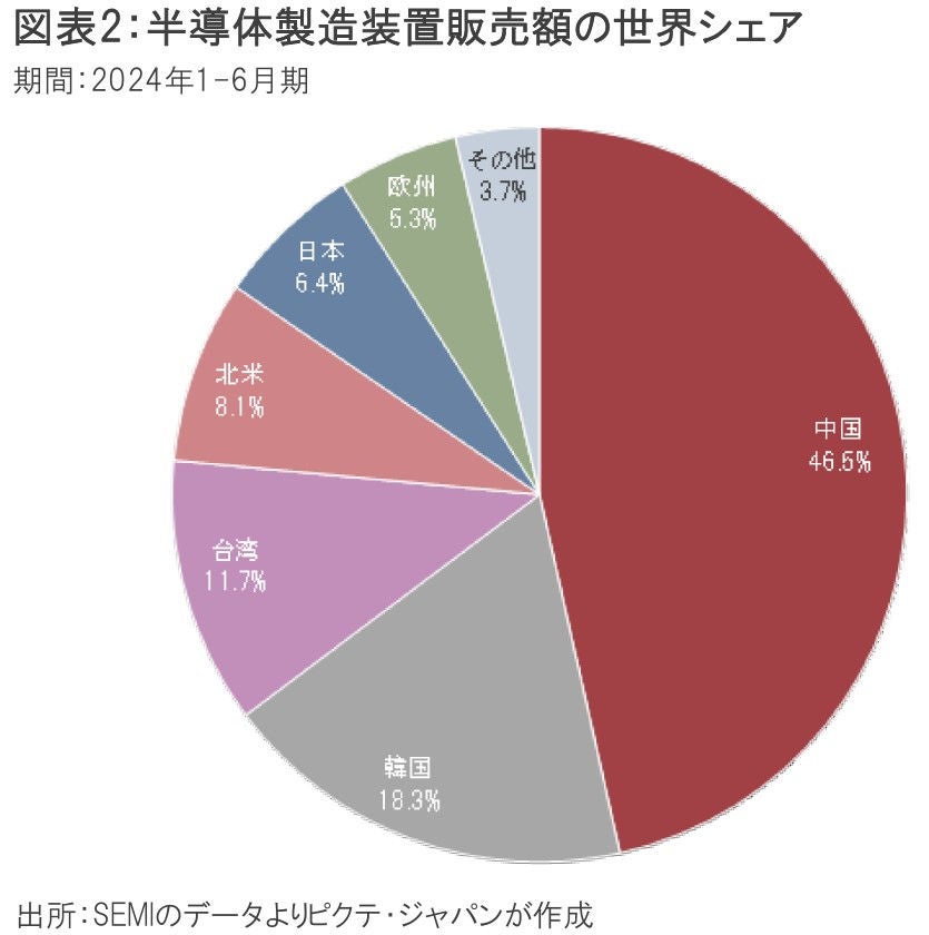 要因は中国に他ならない。SEMIによれば、今年1-6月、半導体製造装置の世界販売額における中国のシェアは46.5%に達した(図表2)。二番目の韓国は18.3%、台湾11.7%、北米8.1%なので、中国は圧倒的な市場規模を誇る。