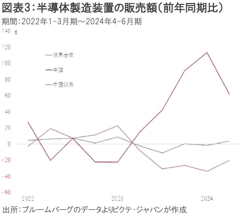 一方、中国の半導体メーカーは米国の規制がさらに強化される可能性を意識したと見られ、2023年10-12月期における同国向けの製造装置輸販売額は前年同期比90.7%増、2024年1-3月期も同113.3%増の極めて高い伸びとなった(図表3)。ただし、4-6月期は同61.7%増であり、駆け込み需要が一巡しつつある可能性を示唆している。さらに、中国の景気減速も影響し、ASMLの7-9月期における受注が大きく減少したのではないか。