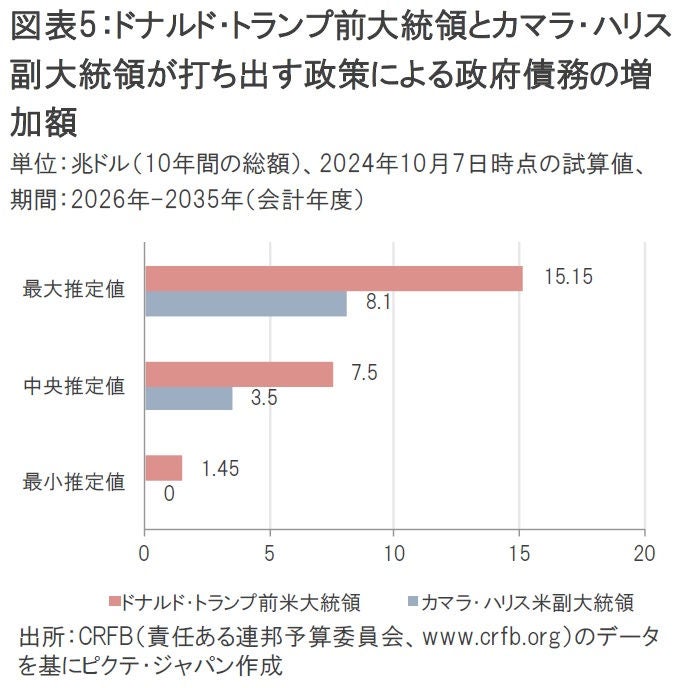 市場が警戒するのは、トランプ氏が打ち出す財政拡張的な政策だ。同氏は自身が大統領任期中の2017年に成立させたトランプ減税(The Tax Cuts and Jobs Act of 2017)を延長・修正する構えだ。CRFB(責任ある連邦予算委員会)の試算によれば、この政策だけで政府債務の増加額が10年間で約5.4兆ドル増加すると見込まれており、その他の歳入・歳出を合わせると計7.5兆ドルの債務増加になるとされている(いずれも中央推定値)。これはハリス氏の3.5兆ドルの債務増加と比較してもかなり大きい(図表5)。
