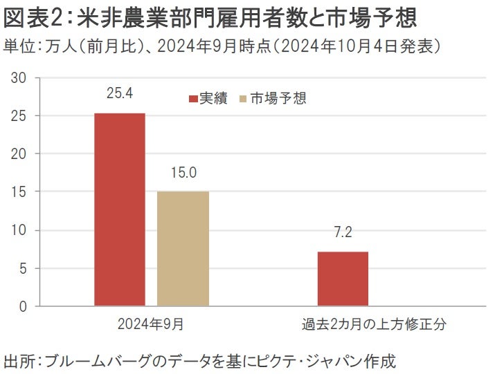 米10年国債利回りの推移を見る限り、これまでの低下トレンドから上昇トレンドへ転換したきっかけは、10月4日に発表された9月の米雇用統計だ。9月の米非農業部門雇用者数は前月比25.4万人増と市場予想の同15.0万人増を大幅に上回ったほか、過去2カ月についても計7.2万人分が上昇修正された(図表2)。