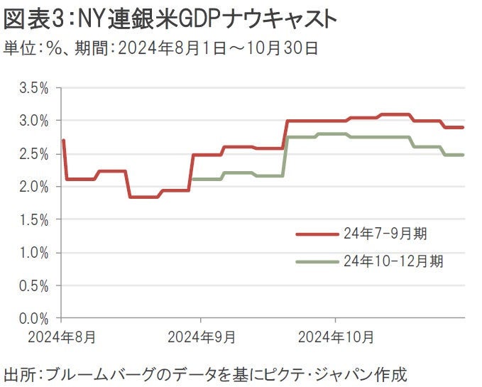 底堅い雇用統計は米GDPの予測値にも表れている。9月の米雇用統計が反映されたNY連銀米GDPナウキャストは、24年7-9月期で前期比年率+3.0%前後で推移していた(図表3)。10月30日に発表された実績値の24年7-9月期米実質GDP成長率も、前期比年率+2.8%だった。一時は景気後退入りも危ぶまれていたが、足元の予測値を見る限り、景気の見通しは堅調そのものだ。