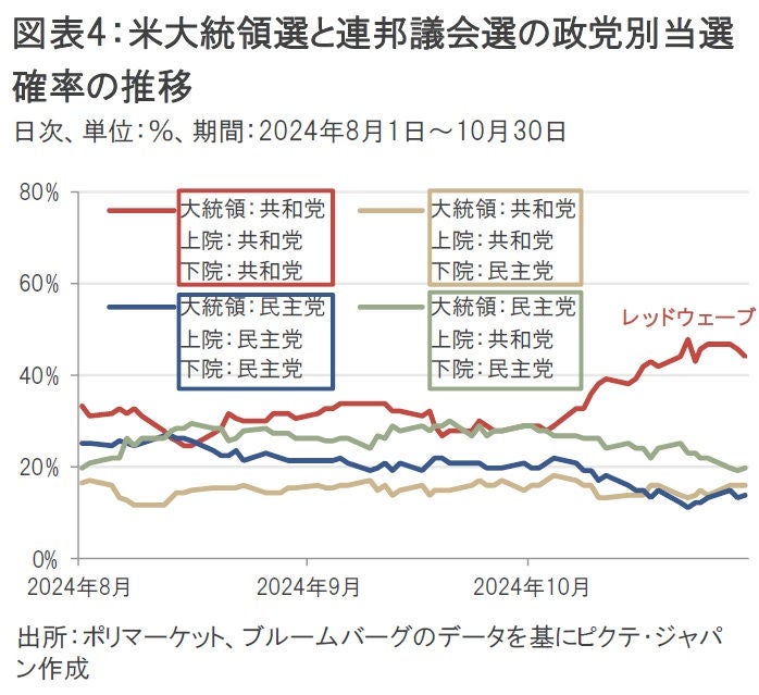 米10年国債利回りの上昇にさらに拍車をかけているのが、共和党のトランプ氏が勝利し、上下両院も共和党が過半数を確保する「レッド・ウェーブ(赤の波)」の確率上昇だ(図表4)。賭けサイトのポリマーケットでは、米大統領選と連邦議会選で共和党が全勝するシナリオが10月から急上昇しており、ちょうど米10年国債利回りの上昇とも重なっていることが分かる。