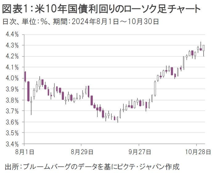 米10年国債利回りは今月に入ってから上昇基調となっている。10月29-30日には取引時間中に一時4.3%台をつけるなど、9月17日につけた3.5%台からわずか1カ月強でおよそ0.8%ポイント上昇した(図表1)。