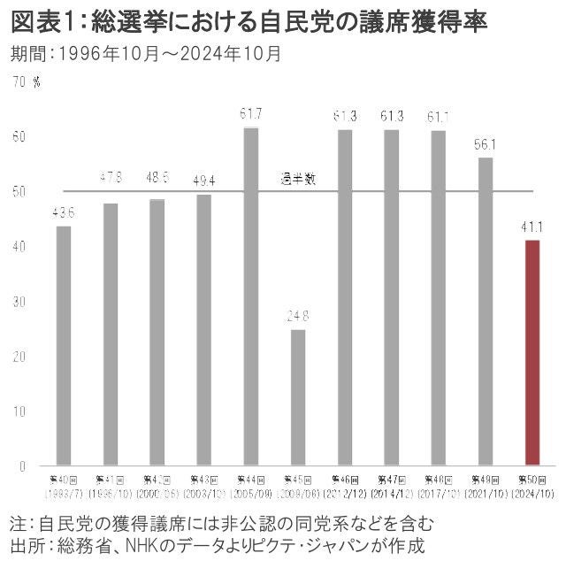総選挙で自民党は191名が当選したが、非公認でった同党系の当選者を加えれば、実質的には197議席と言える。ただし、それでも議席獲得率は42.4%であり、この30年間では政権を失った2009年8月の第45回に次ぐ低水準だ(図表1)。