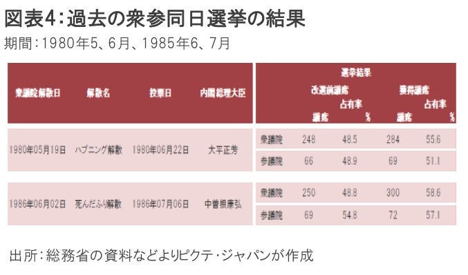 改めて総裁選を実施、新たな総裁・内閣総理大臣の下で与党への逆風が和らげば、通常国会会期末に衆議院を解散して衆参同日選挙を行うことも選択肢と言えそうだ。ダブル選挙は、1980年と1985年に過去2回の例がある。この2回は組織力の強さで自民党が圧勝した(図表4)。