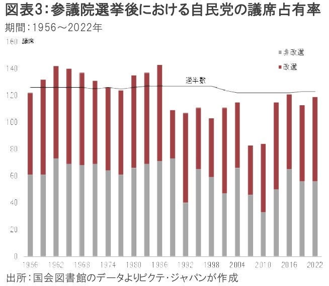自民党は参議院で114議席であり、27議席を持つ公明党との連立で過半数の125議席を確保してきた(図表3)。ただし、次の参院選で与党が17議席を失えば、衆参両院において過半数割れとなり、政権維持は実質的に困難になると見られる。