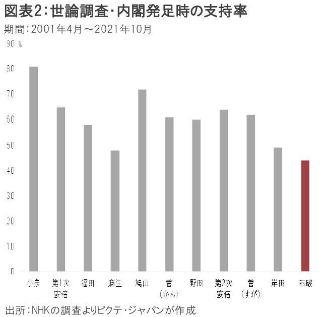 同党の誤算は、9月27日の総裁選挙で有権者の人気があった石破首相を選んだにも関わらず、石破内閣の支持率が、歴代10内閣の発足時と比べ極めて低くかったことだろう(図表2)。人事などでの冷遇に耐え、党内野党的姿勢を堅持してきたことが、同首相の人気の背景だった。しかし、内閣総理大臣就任後、党内融和を優先、総裁選で反対していた早期解散に踏み切った上、積極的だった夫婦別姓などについての態度を曖昧にしたことから、政治とカネの問題に対する自民党の逆風を撥ね返せなかったと見られる。