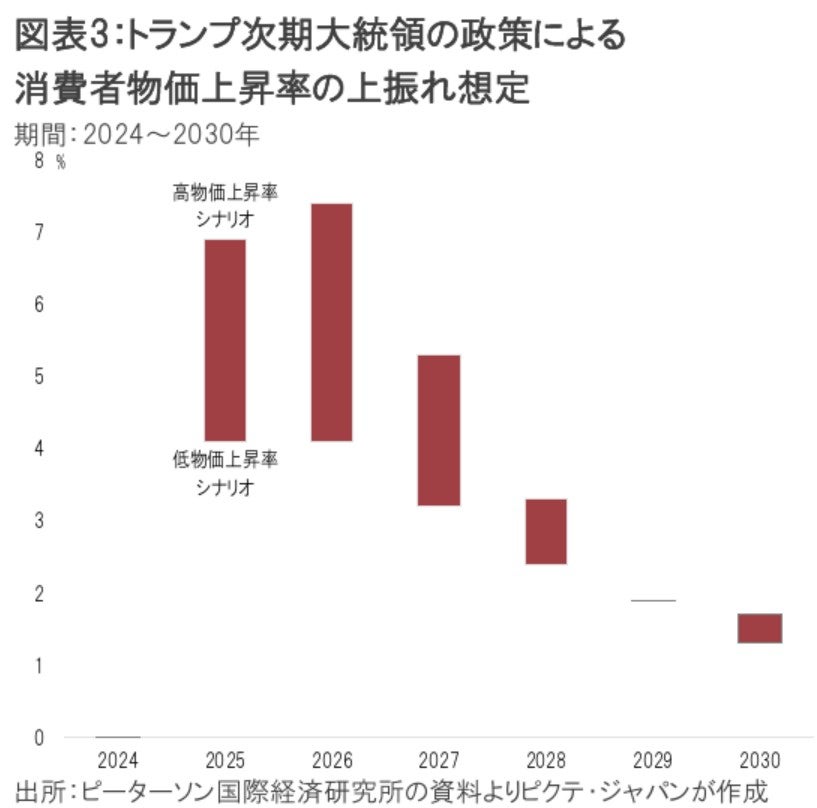 ピーターソン国際経済研究所は、9月26日にレポートを発表、基礎的関税を中心とするトランプ次期大統領の政策が実現した場合、2026年の消費者物価上昇率は平均的な水準から4.1~7.4%ポイント押し上げられるとの見方を示した(図表3)。トランプ次期大統領はジョー・バイデン政権下の物価上昇を厳しく批判してきたが、自らもインフレの抑制に苦労する可能性が強い。