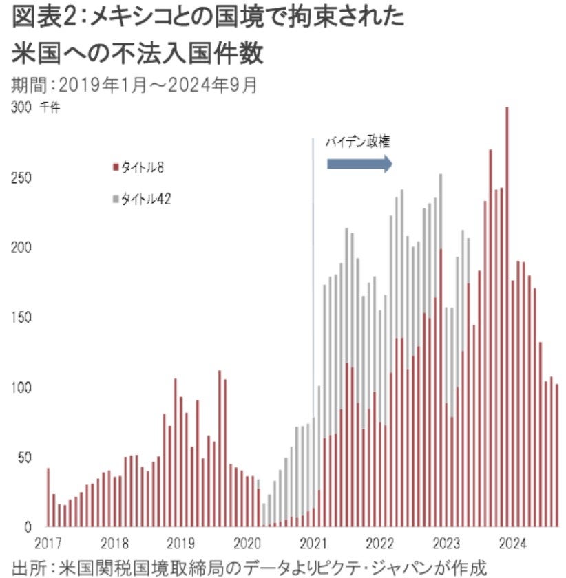 一方、第1次政権において、メキシコとの国境で拘束された不法入国者は低水準に抑制されており、トランプ次期大統領は移民問題で成果を挙げた(図表2)。ジョー・バイデン大統領が移民に寛容だったわけではないが、民主党政権のイメージもあり、拘束される不法入国者は急増している。それが、大統領選挙にも影響したと言えるだろう。