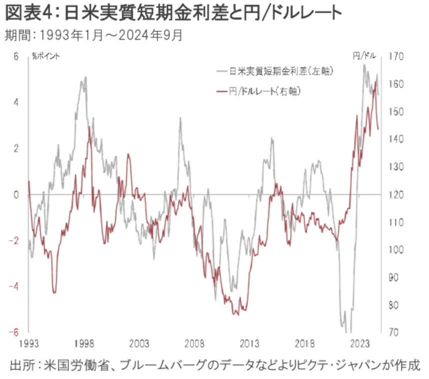 もっとも、円相場は中期的には日米の実質短期金利差に大きく影響される傾向が強い(図表4)。トランプ次期大統領の経済政策が米国のインフレを加速させた場合、実質金利の日米逆転により、一定期間、ドル安・円高となることも考えられる。