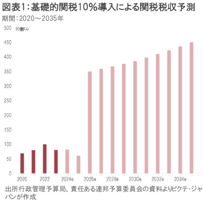 トランプ次期大統領は、選挙期間中、全ての輸入品に10%、もしくは20%、中国製品には60%の関税を課す基礎的関税の導入を訴えた。2023年度における加重平均関税率は2.4%であり、実現すれば大幅な増税になる。超党派のシンクタンクである責任ある連邦予算委員会によると、2024年度に814億ドルだった関税収入は、10%の基礎的関税導入により2026年度には3,500億ドルへ拡大する見込みだ(図表1)。
