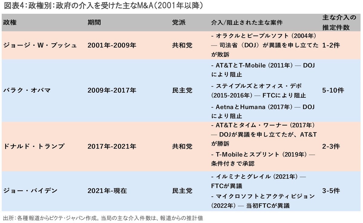 次葉図表4の通り、民主党政権下での大型M&Aへの政府の介入件数は、共和党政権下の件数を大きく上回る。例えば、民主党バイデン政権では、2022年にマイクロソフトがアクティビジョンに対し690億ドルに上る巨額買収に乗り出したが、政府は独占禁止法の観点からこれに何度も異議を申し立てた。結局2023年10月にこの買収は成立したが、当初予定から大幅に遅延した 。