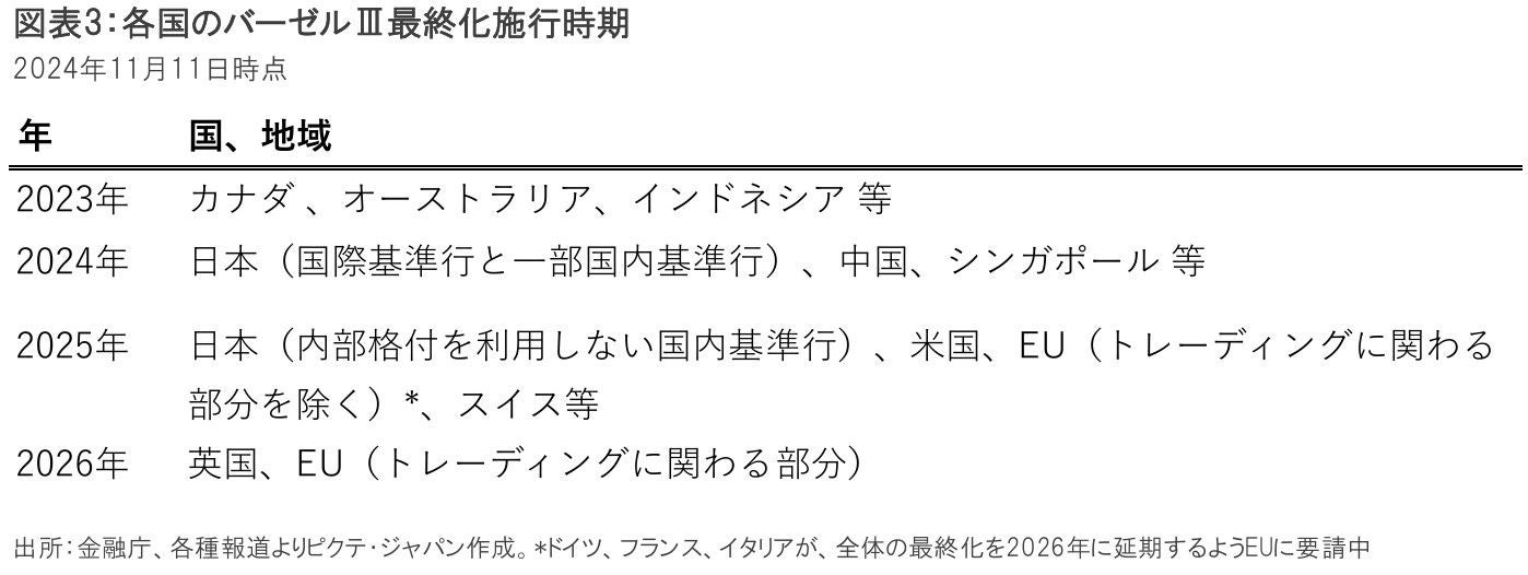米国については、現時点では2025年7月に施行するスケジュールとなっているが、やや不透明な情勢となっている。米監督当局は、昨年、グローバルなシステム上重要な銀行(G-SIBs)に対し、普通株式Tier1(CET1)資本要件を19%増加させるという厳格な改正内容を発表した。しかし、業界からの痛烈な批判を受け、今年に入り、要件を大幅に緩和し、G-SIBsの所要資本の増加幅が約9%程度に留まるような案を提示する予定とされている。また、G-SIBs以外の銀行についても、大手行に準じる厳格な規制を適用するという案になっていたが、引き続き別枠の規制となる可能性が高まっている。現在当局間でも意見に食い違いが見られると報じられており、トランプ大統領の下で、大きく修正される可能性もある。これらを取りまとめる時間を考えると、施行時期も延期される可能性が高いと考えられる。
