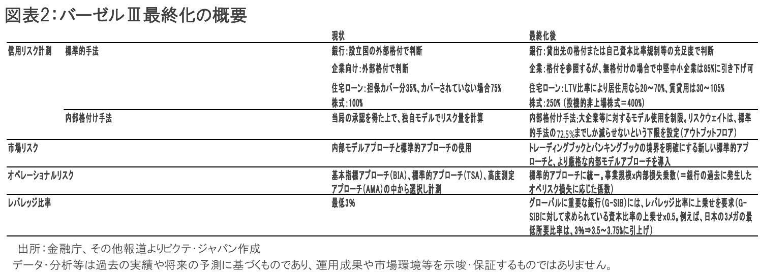 現在、世界の金融規制は、主要諸国の中央銀行総裁会議によるバーゼル銀行監督委員会(Basel Committee on Banking Supervision、BCBS)の枠組みに基づいている。この枠組みには現在世界28か国の銀行が参加している。1975年のバーゼルの初会合から来年でちょうど50年となる。過去、バーゼル規制は段階的に厳格化されてきたが、2017年に「エンドゲーム」と呼ばれる最終的な厳格化案が合意された(図表1)。これまでも、リセッションで金融システム不安等が発生する毎に規制強化が議論されたが、今回は、項目が多岐に亘り、踏み込んだ内容が含まれていたことから(図表2) 、最終化まで時間を要した。バーゼルは、一定のスケジュール内での実施を推奨しているが、直接的な執行権限は持っていない。その結果、実施のタイミングや具体的な要件において国ごとにばらつきが生じることが多い。