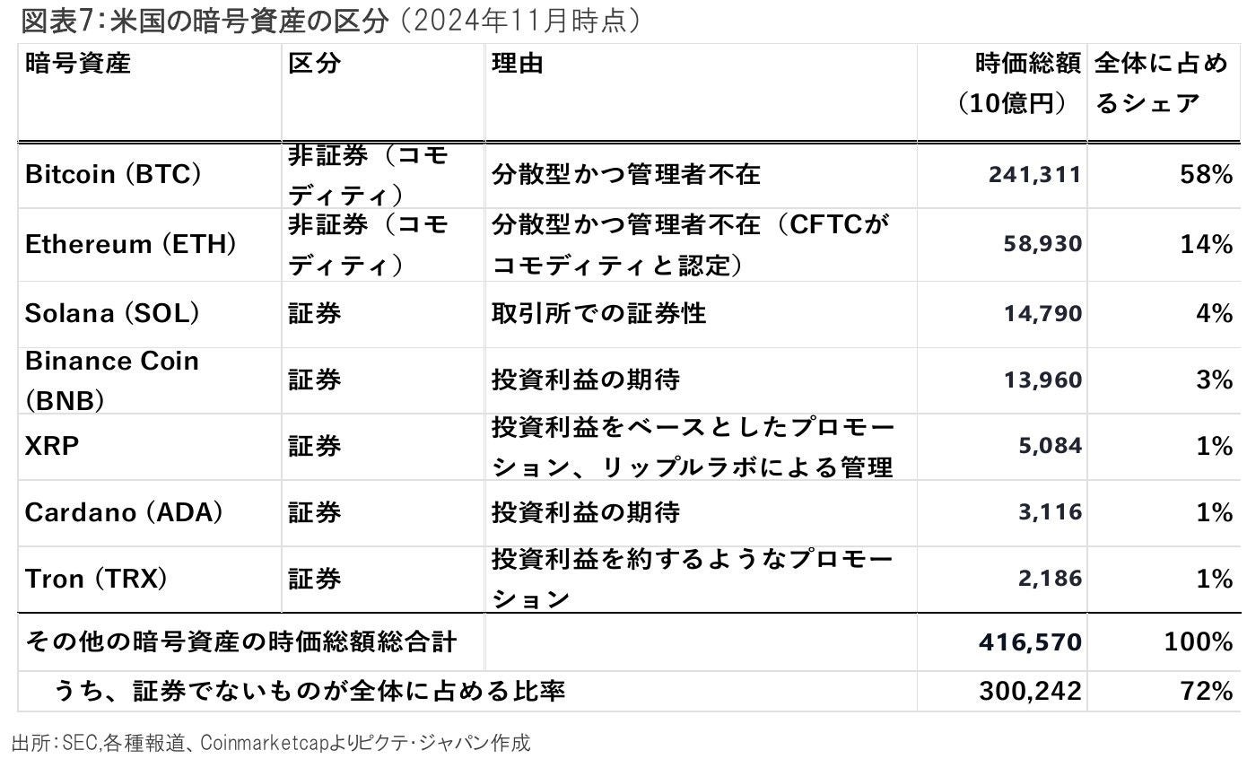 暗号資産規制の最大の焦点は、個別の暗号資産が証券であるか否か、という判断である。暗号資産が証券かどうかは、「ハウィ・テスト」という1940年代以降用いられている基準によってSECが個別に判断している。現在、ビットコインとイーサリアム以外の殆どが証券と見なされ、厳格なSECの管轄とされている(図表7)。しかし、ビットコインとイーサリアムが証券に区分されていないため、暗号資産全体の時価総額ベースでは、 70%は証券ではないという、ややわかりにくい状態になっている。SECの体制変更でこれらの不透明性を払拭すれば、スタートアップ企業の暗号資産での資金調達が容易になる可能性がある。