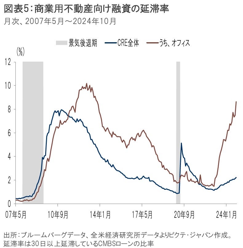 商業用不動産(CRE)に対するローン、特にオフィス向けローンの延滞は、リーマンショック後の最高値に近づきつつあり、米国経済の数少ない懸念材料となっている(図表5)。2023年に中堅中小銀行のCRE与信の大きさが問題になったことから、同年夏に、厳格なガイドラインが当局から示された。CREローンの残高が資本プラス引当金の300%を超える場合や、CREローンが急激に増加している場合、特定の資産クラスに与信が集中している場合等について、より厳格な管理を銀行に求めるというものだ。